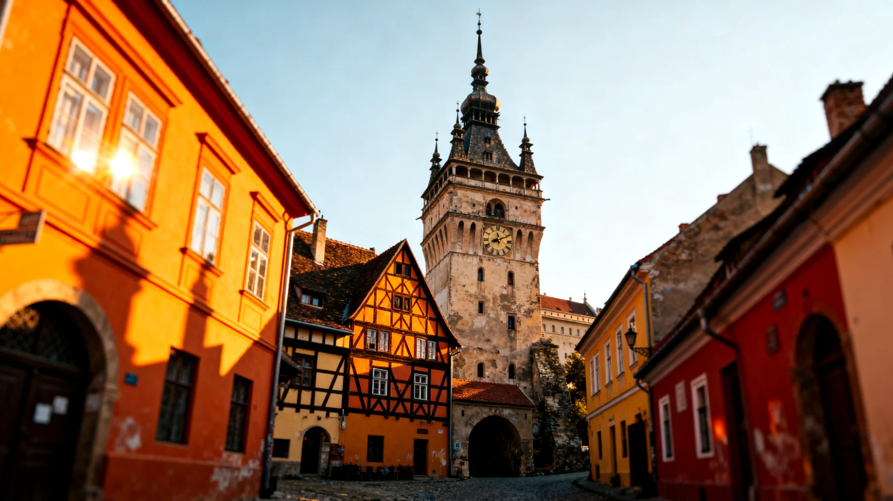 Das Herzstück von Sighișoara ist die Cetatea Sighișoarei, die befestigte Oberstadt, die wie eine Insel aus dem 14. Jahrhundert mitten in der Moderne wirkt. Über die überdachte Schülertreppe – eine hölzerne Konstruktion mit 175 Stufen – gelangt ihr hinauf zu diesem architektonischen Juwel. Im Februar kann diese Treppe etwas rutschig sein, aber gerade das gemeinsame Hochsteigen mit Freunden, das gegenseitige Festhalten und Lachen macht den Aufstieg zu einem ersten gemeinsamen Abenteuer.